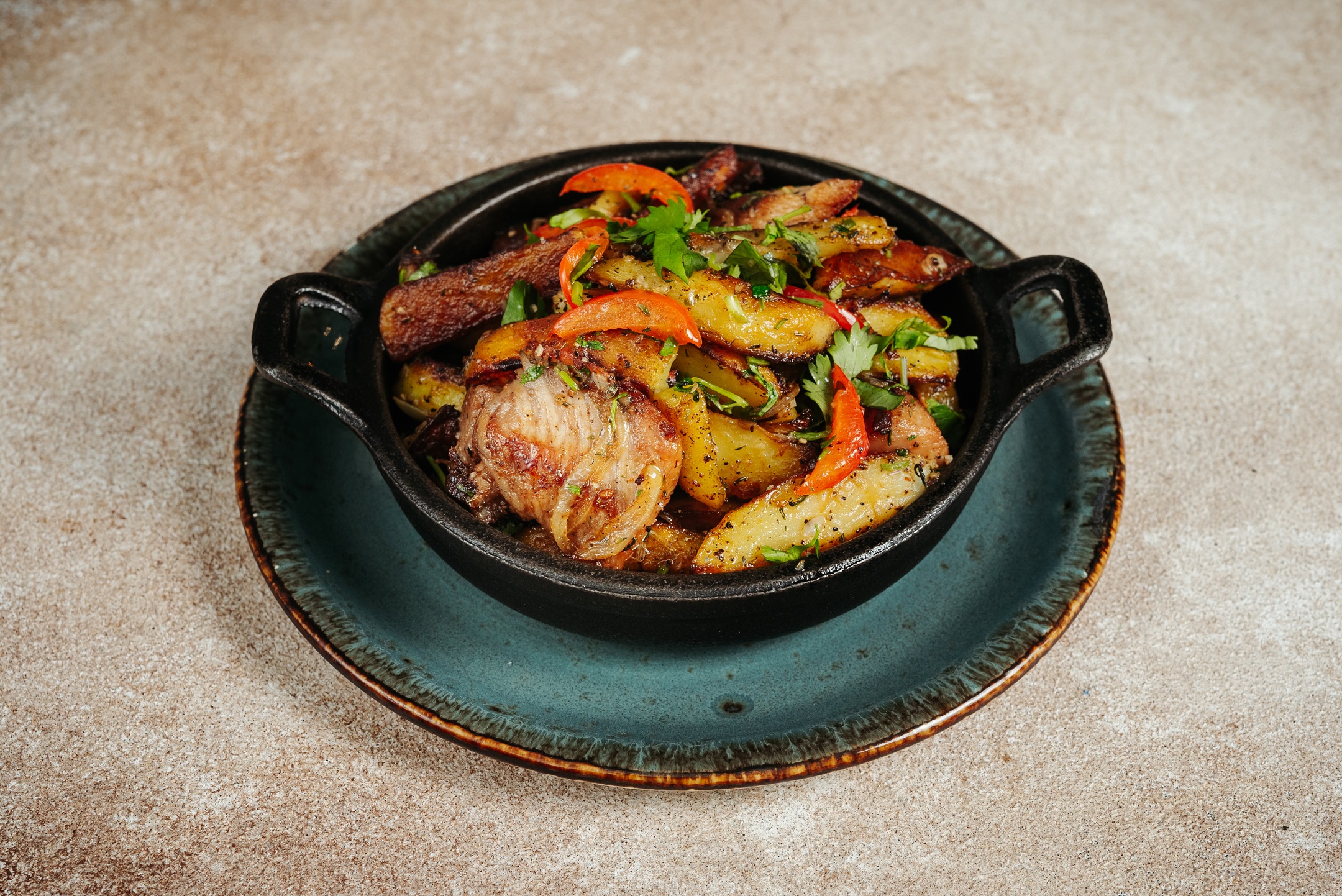 Курица с обжаренным до золотистого цвета с картофелем, с томатами черри , свежей зеленью, чесноком, луком и грузинскими специями.